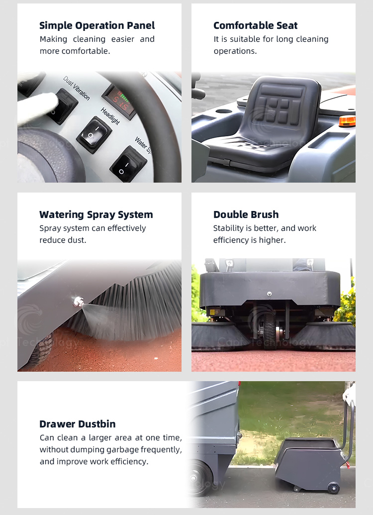 CAPT-E8006 driving sweeper has high cleaning efficiency and can clean up dust, stones, wood chips, glass and other garbage. It is suitable for operation on the flat ground such as cement, asphalt, ceramic tile, marble, etc., and can clean dust, stones, wood chips, glass and other garbage.