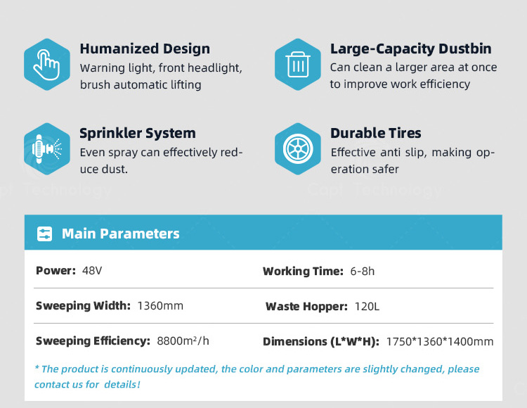 CAPT-S1800 has beautiful appearance, good cleaning effect, and can quickly clean large areas. It is widely used in  municipal sanitation, exhibition venues, industrial parks, residential areas, commercial walking streets, parking lots,  tourist attractions and other public places.