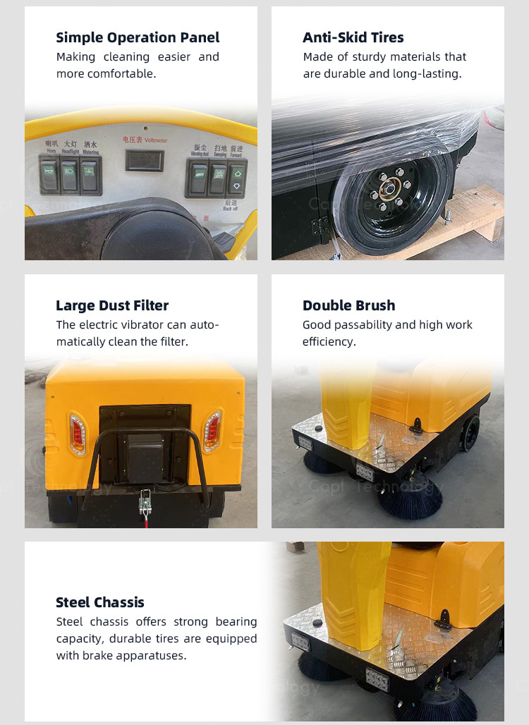 CAPT-E8006 driving sweeper has high cleaning efficiency and can clean up dust, stones, wood chips, glass and other garbage. It is suitable for operation on the flat ground such as cement, asphalt, ceramic tile, marble, etc., and can clean dust, stones, wood chips, glass and other garbage.