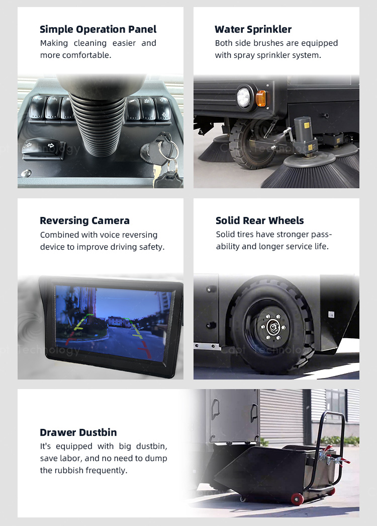 This fully enclosed four-wheel drive sweeper is an electric garbage sweeper that integrates cleaning, vacuum and watering. Mechanized operation not only has high cleaning efficiency and good results, but also can clean everything, such as dust sand, stones, leaves, and cigarette boxes, bottles and etc. It's Suitable for indoor and outdoor cleaning operations in cleaning companies, property management companies, parks, sanitation, rural streets, sidewalks, squares, and universities.