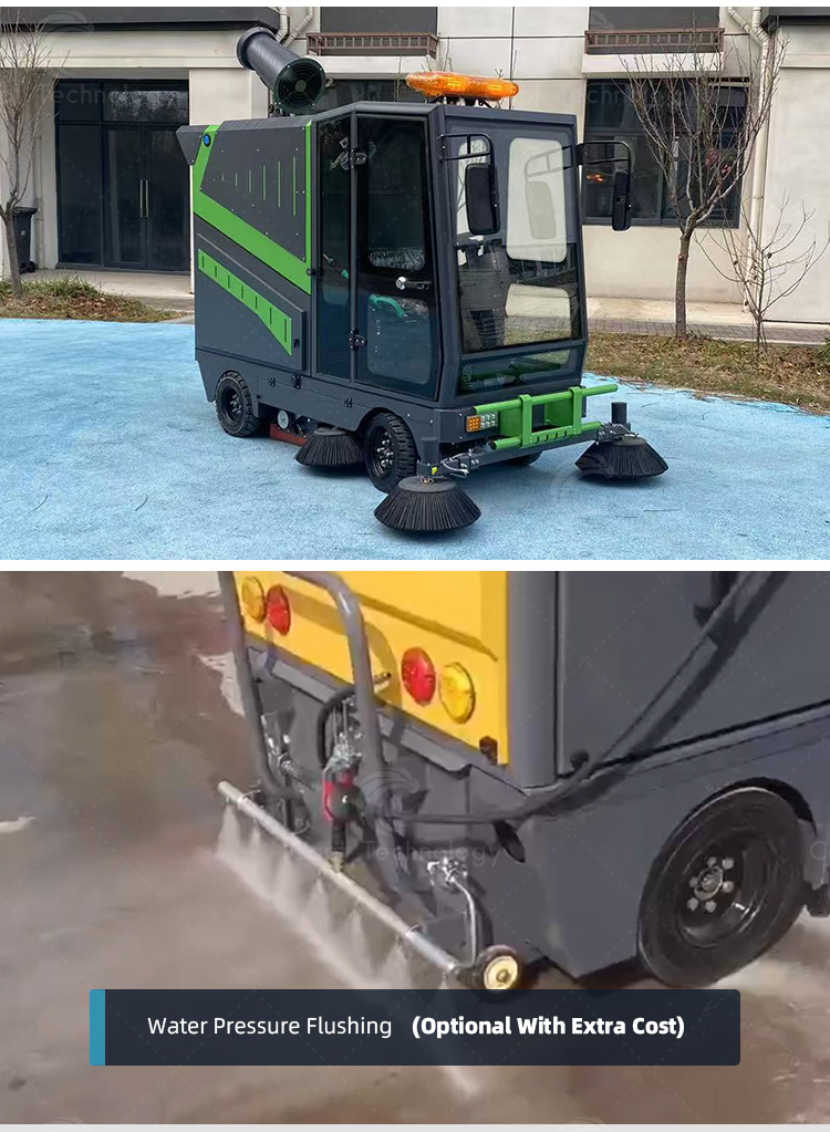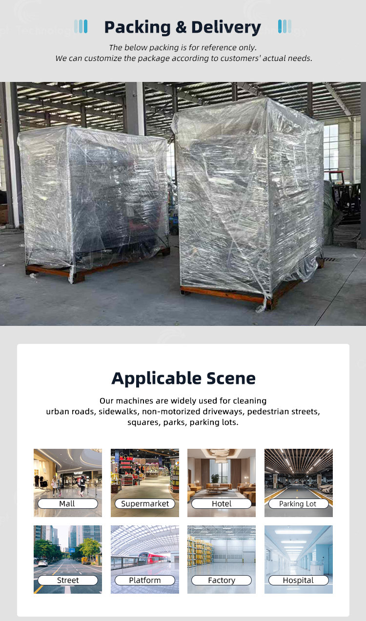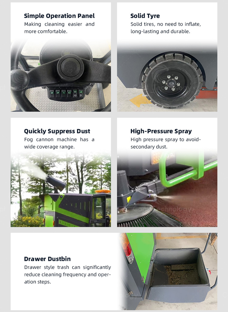 It is a fully enclosed driving sweeper. This sweeping vehicle is suitable for indoor and outdoor cleaning operations in cleaning companies, property management companies, parks, sanitation, rural streets, sidewalks, squares, and universities.