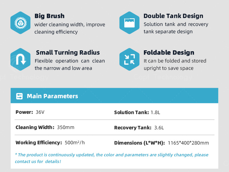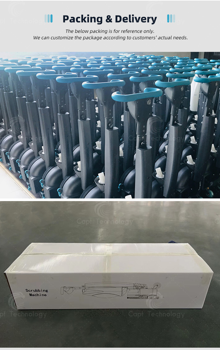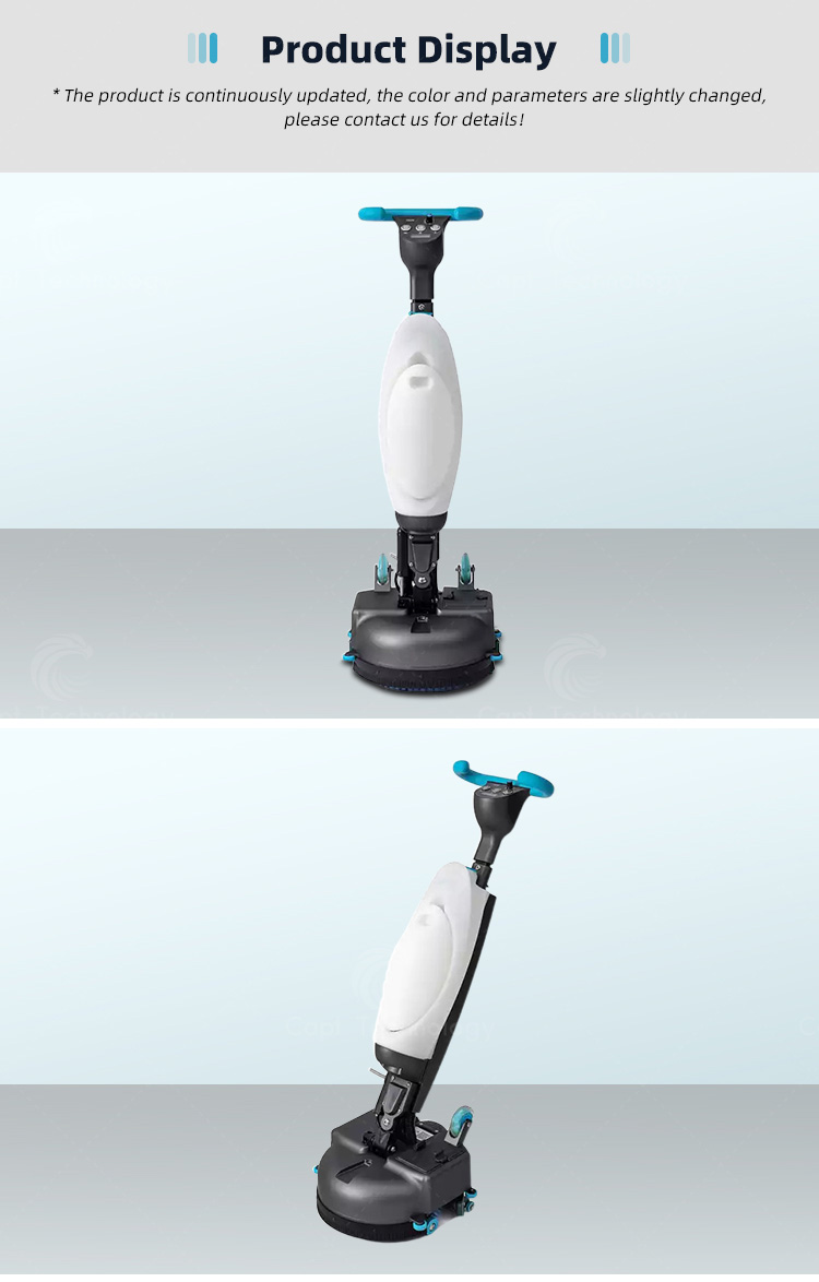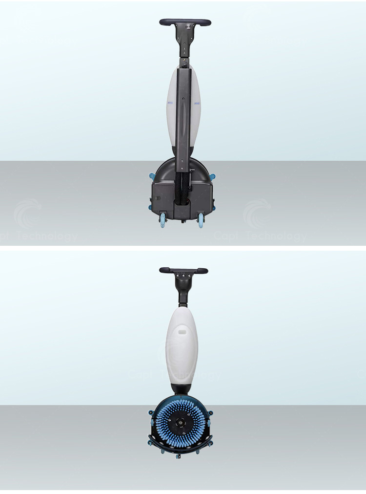 This scrubber is suitable for cleaning flat surface. The dirty water is sucked into the sewage tank by the suction scraper behind the machine. The product is beautiful in appearance, small in size, easy to carry, and clean the narrow and low area that the general floor washer can't reach.