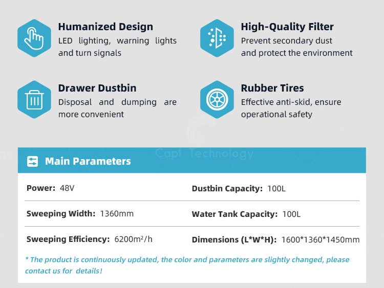 The driving electric sweeper is an automated cleaning machine that combines vacuuming, sweeping, and water spraying functions. Its operation panel is simple and practical, ensuring user-friendly operation. Equipped with a wheel-mounted dustbin for easy emptying.