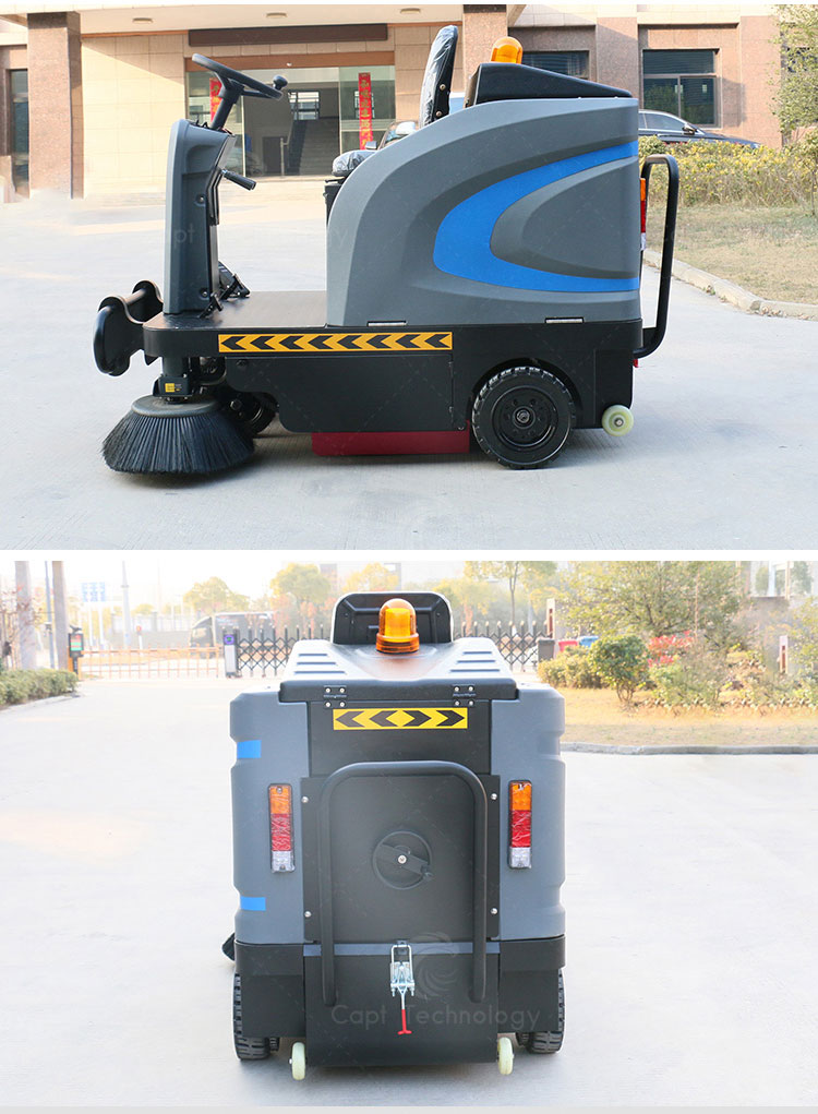 The driving electric sweeper is an automated cleaning machine that combines vacuuming, sweeping, and water spraying functions. Its operation panel is simple and practical, ensuring user-friendly operation. Equipped with a wheel-mounted dustbin for easy emptying.