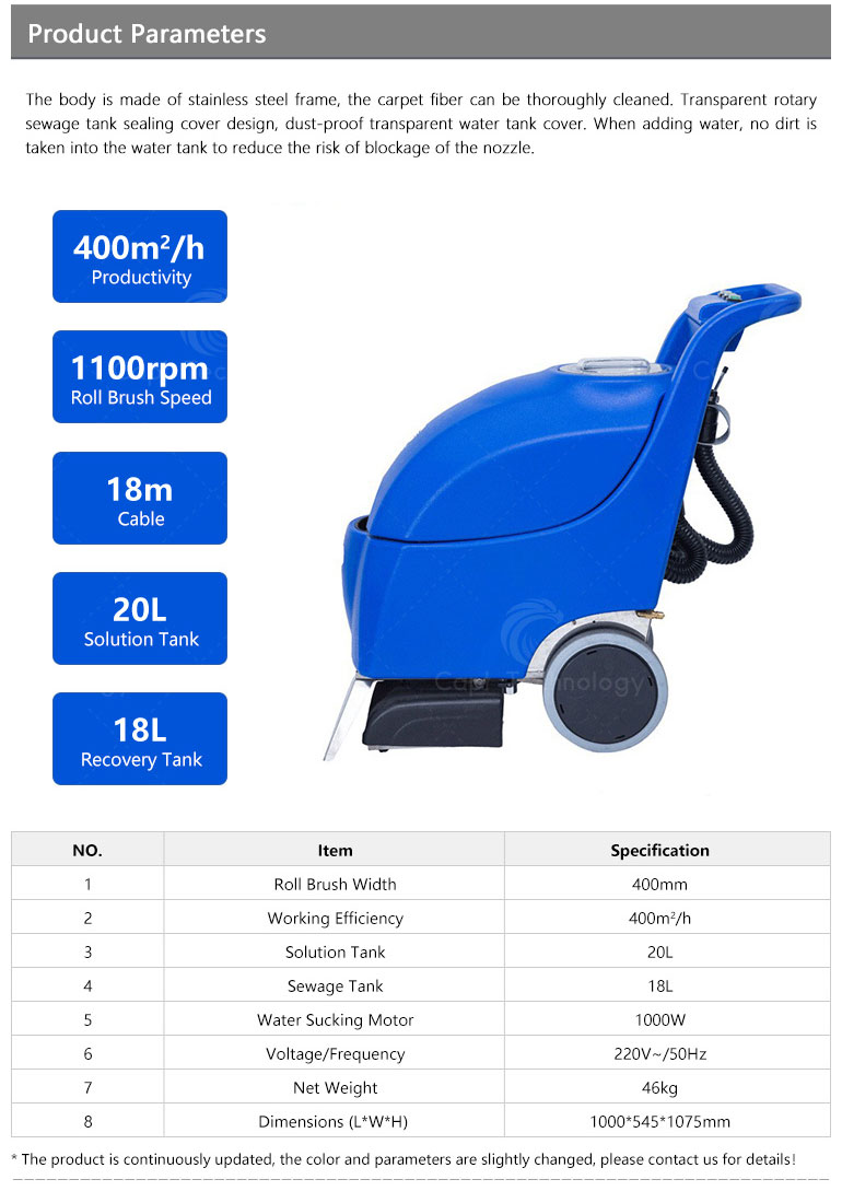 Mainly used in offices, hotels, halls and other carpet sites. The body is made of stainless steel frame, the carpet fiber can be thoroughly cleaned, and the machine is equipped with an external hand-held water spray connector. Transparent rotary sewage tank sealing cover design, dust-proof transparent water tank cover. When adding water, no dirt is taken into the water tank to reduce the risk of blockage of the nozzle.
