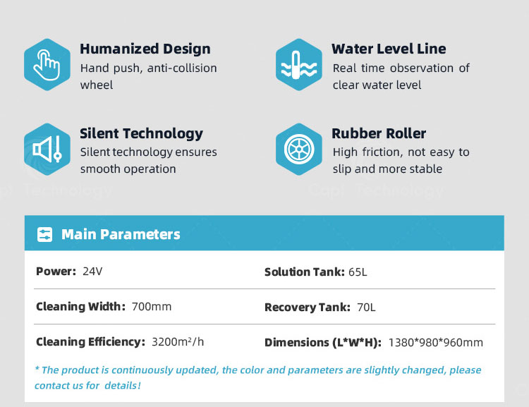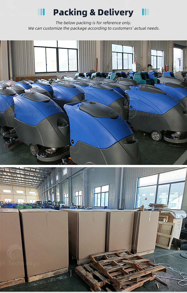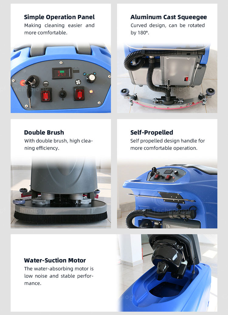 It is suitable for the cleaning of flat ground. The dirty water is sucked into the sewage tank by the squeegee on the rear of the machine. Once the machine is walking on the ground , then it can finish cleaning.