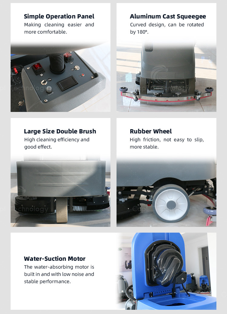 CAPT-V50 walk behind floor scrubber combines washing, vacuuming and drying, especially for area cleaning of ceramic tile, marble, epoxy resin and cement floors, which is widely used in supermarket, government office, hospital, hotel, terminal building, subway platform and etc.