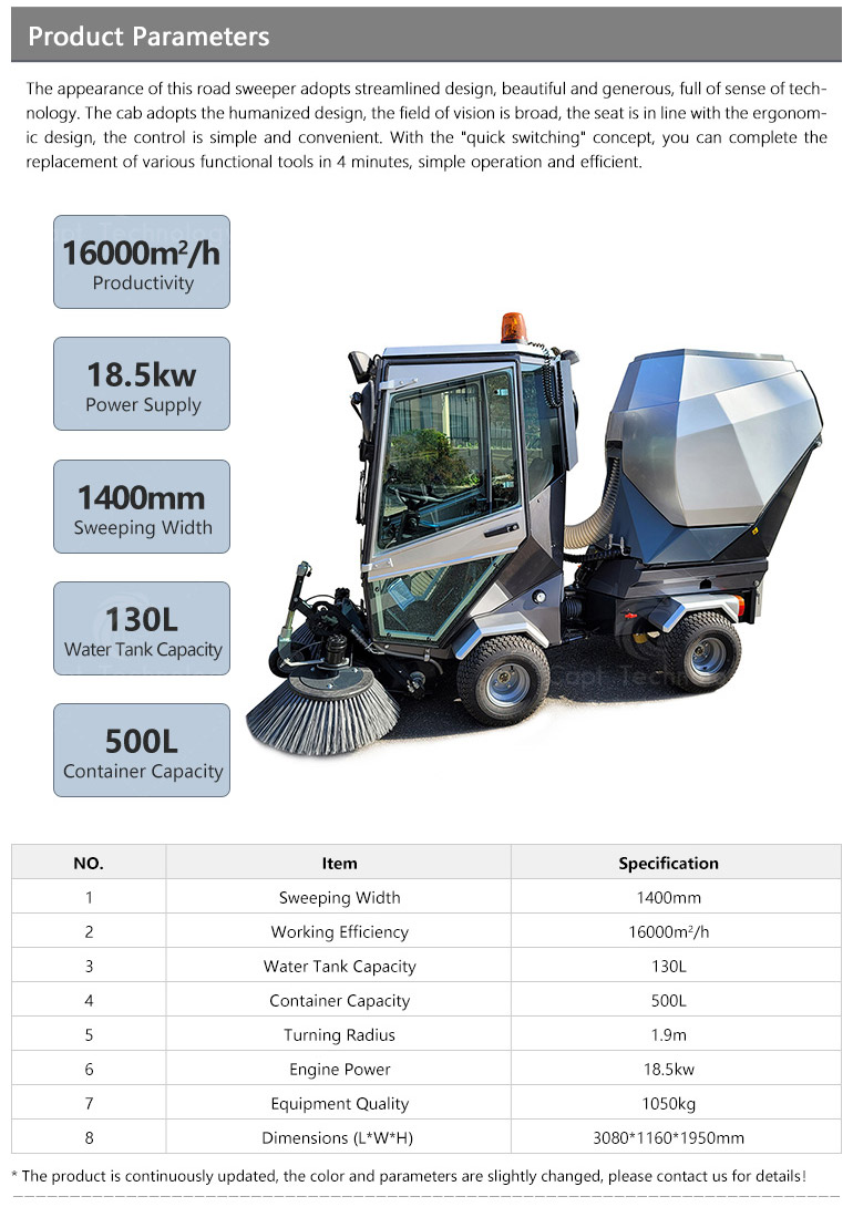 It’s widely used in cleaning work of urban roads, sidewalks, non-motorized roads, pedestrian streets, squares, parks, parking lots and other places. Especially suitable for narrow curved road cleaning. Streamlined appearance, beautiful and generous, full of technology.