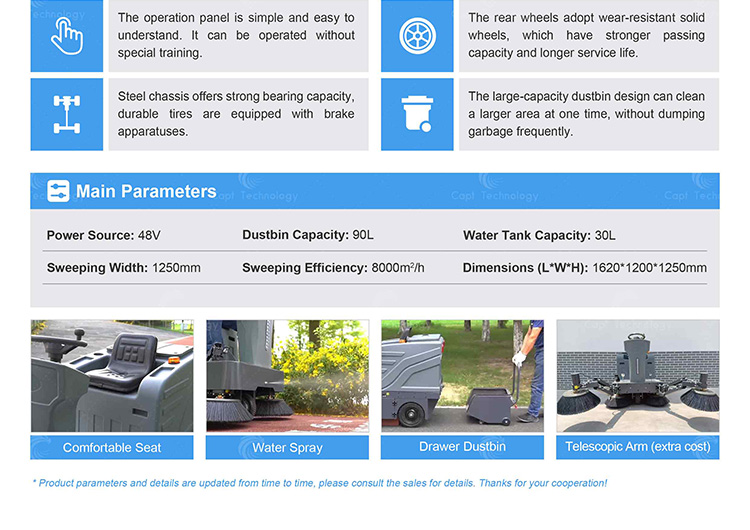 This sweeper is small and flexible, can turn on the spot, and can enter the elevator, especially suitable for working in small spaces, such as various office buildings, shopping malls, hospitals, schools, sidewalks, etc.