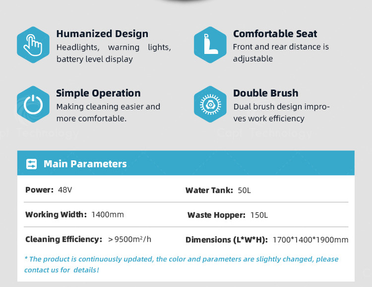 CAPT-S1800 has beautiful appearance, good cleaning effect, and can quickly clean large areas. It is widely used in  municipal sanitation, exhibition venues, industrial parks, residential areas, commercial walking streets, parking lots,  tourist attractions and other public places.