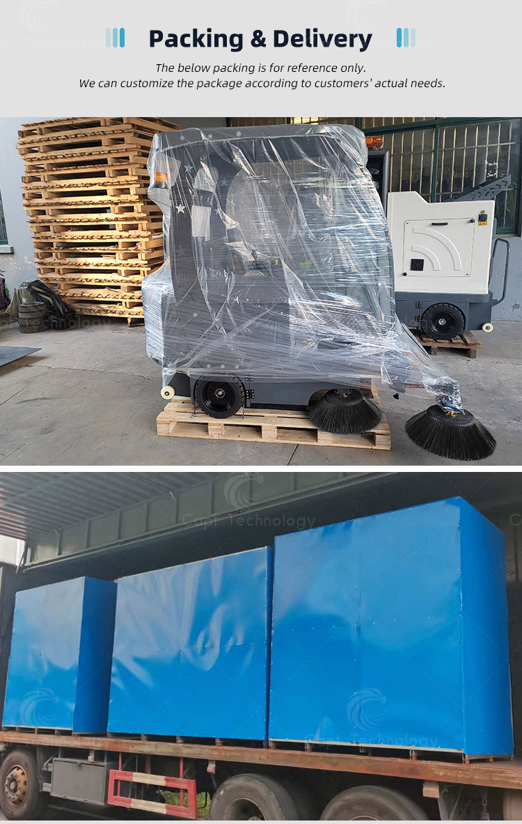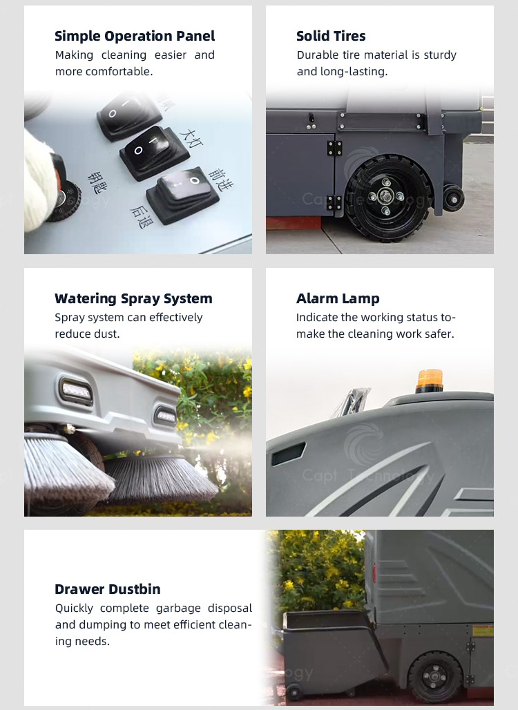 CAPT-E8006 driving sweeper has high cleaning efficiency and can clean up dust, stones, wood chips, glass and other garbage. It is suitable for operation on the flat ground such as cement, asphalt, ceramic tile, marble, etc., and can clean dust, stones, wood chips, glass and other garbage.