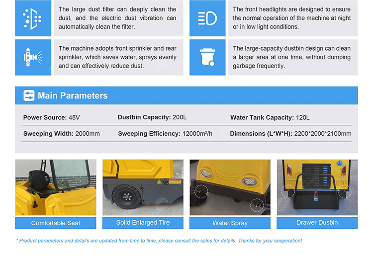 It is a relatively popular sweeper has high cleaning efficiency of vacuum, sweeping and watering. Designed with enlarged chassis, the sweeping width is 2000mm, which offers high work efficiency. Use of high-performance maintenance-free batteries, featured by no leakage and no harmful gases.