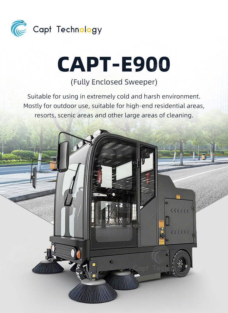 CAPT-E900 enclosed sweeper adopts fully enclosed cab design, and it is mostly suitable for using in extremely cold and harsh environment. Mostly for outdoor use, suitable for high-end residential areas, resorts, scenic areas and other large areas of cleaning.