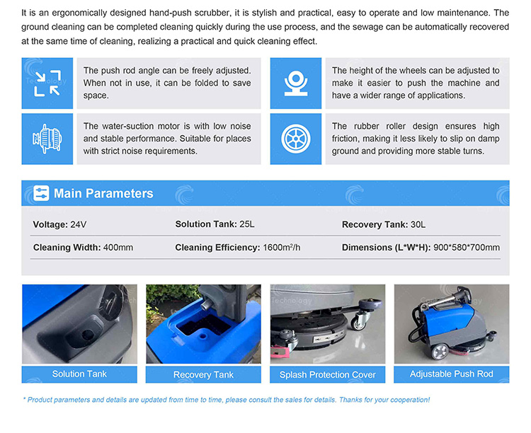 It is an ergonomically designed hand-push scrubber, it is stylish and practical, easy to operate and low maintenance. The ground cleaning can be completed cleaning quickly during the use process, and the sewage can be automatically recovered at the same time of cleaning, realizing a practical and quick cleaning effect.